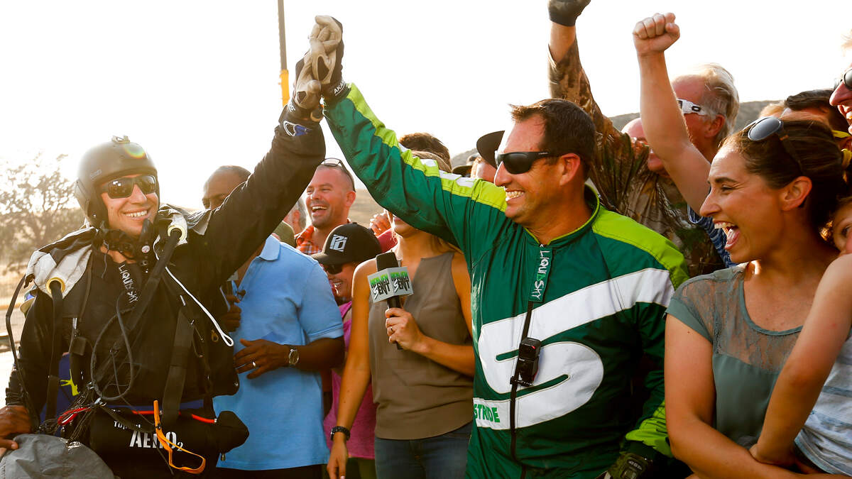 He jumps out of the plane at 25,000 feet with a bunch of other skydivers who have chutes, and keep in mind, he was doing this on live TV with a 5 second delay, so if the screen went dark the audience would know Luke had a bad day. Watch the numbers tick down until the other jumpers peel away. Then I'm thinking that he has a wingsuit, but he doesn't.